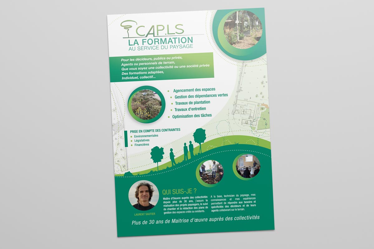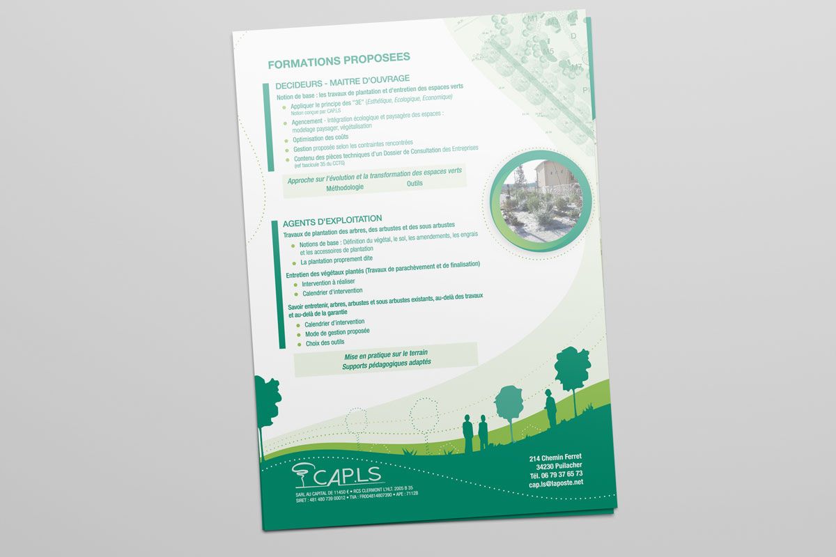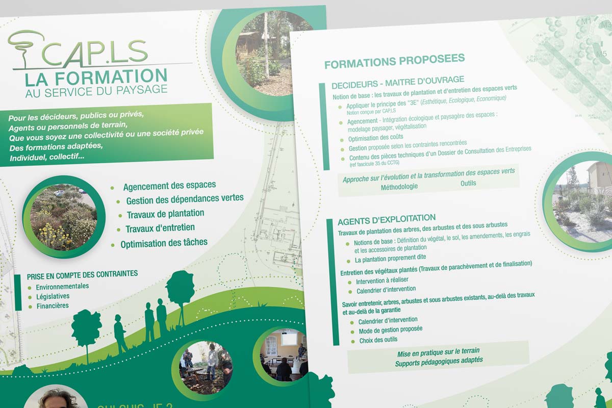 Création graphique d’une plaquette commerciale A4, recto/Verso pour Cap LS, entreprise de formation en paysagisme et en entretien des espace verts, pour les décideurs et les agents des collectivités territoriales.