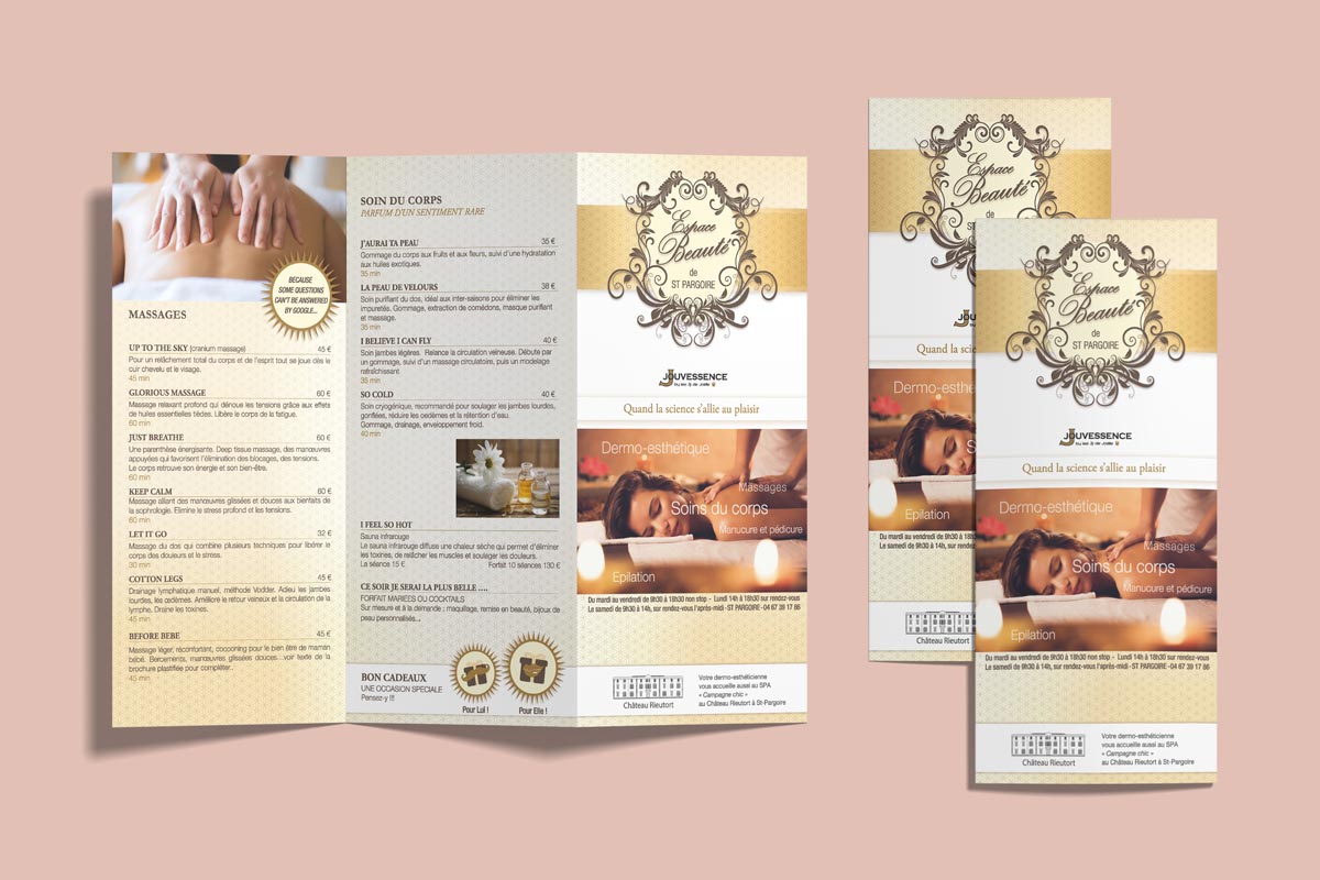Recherches graphiques et réalisation d’un Dépliant A4, 3 Volets, Recto/Verso. Jouvessence, l’institut de Beauté de Saint-Pargoire, souhaitait communiquer auprès de ces clients et prospects, ses nouveaux tarifs ainsi que l’ensemble des services proposés sur place. Une nouvelle identité visuelle devait également être créée pour le Salon de beauté.