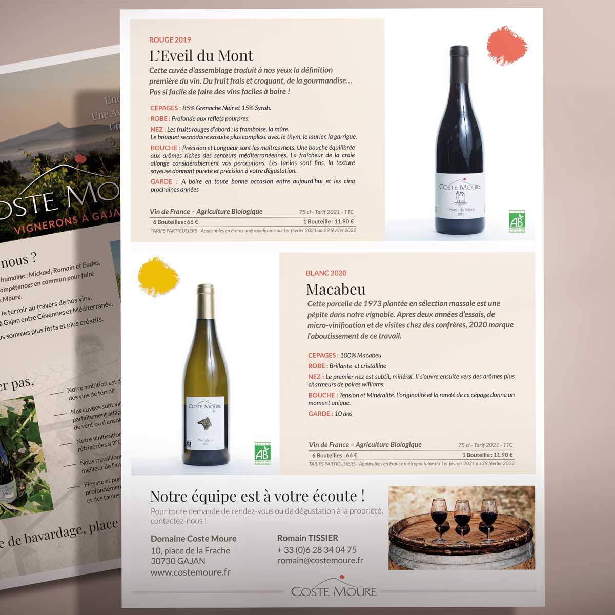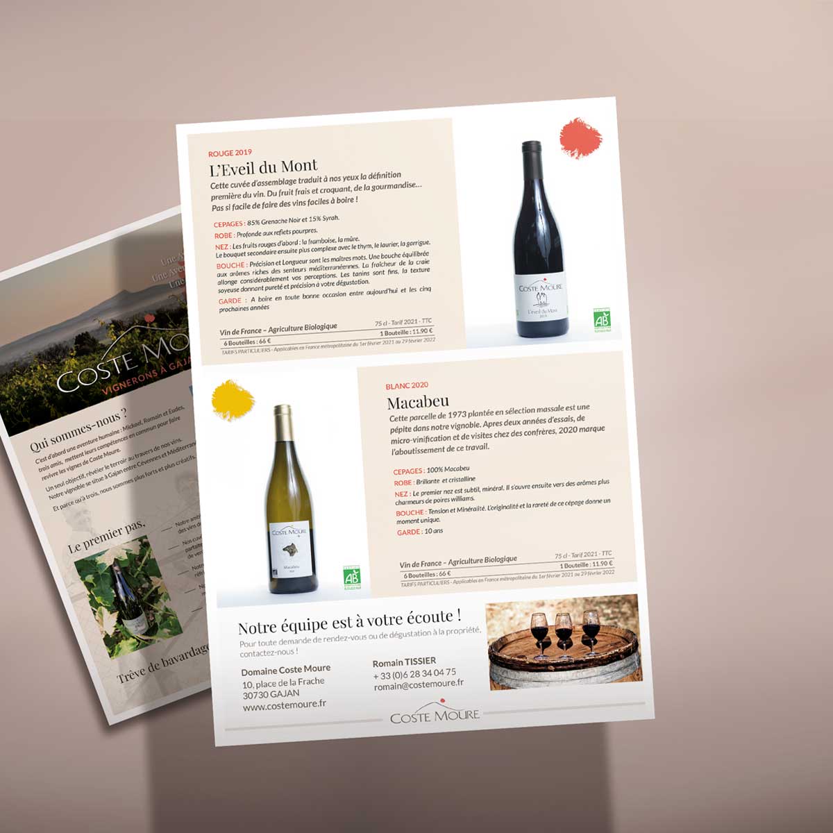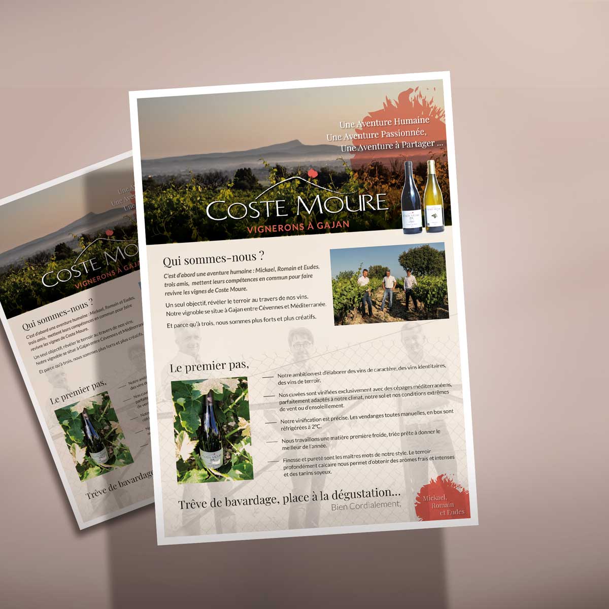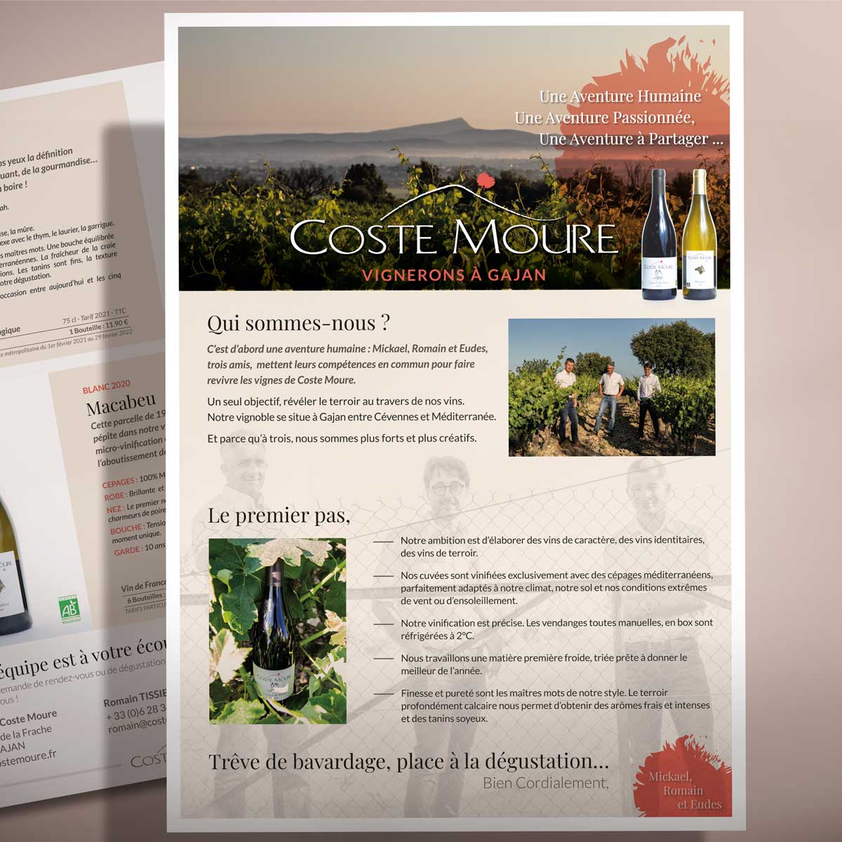 Création graphique d’une plaquette commerciale A4, recto/Verso pour le Domaine Coste Moure à Gajan, d’après la charte graphique créée pour le site internet